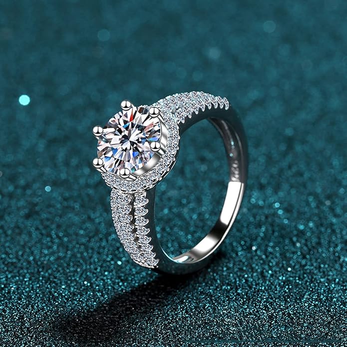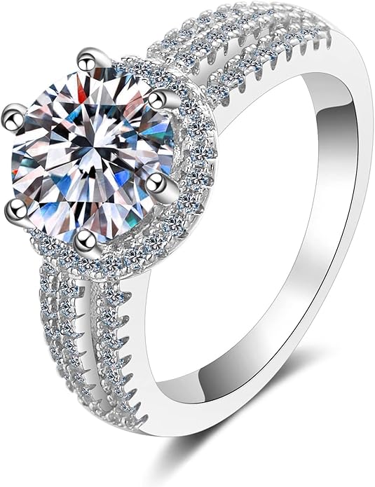 Cette bague de fiançailles est en argent sterling, avec une pierre centrale en moissanite. La pierre centrale est de taille ronde, entourée d’un halo de plus petits diamants pour un éclat supplémentaire. L’anneau est également orné de plusieurs rangées de petites pierres, ce qui lui donne un aspect à la fois large et scintillant. La moissanite, pierre précieuse synthétique, est connue pour sa brillance et sa durabilité, très similaire à celle du diamant. Elle est souvent accompagnée d’un certificat d’authenticité attestant de sa qualité.